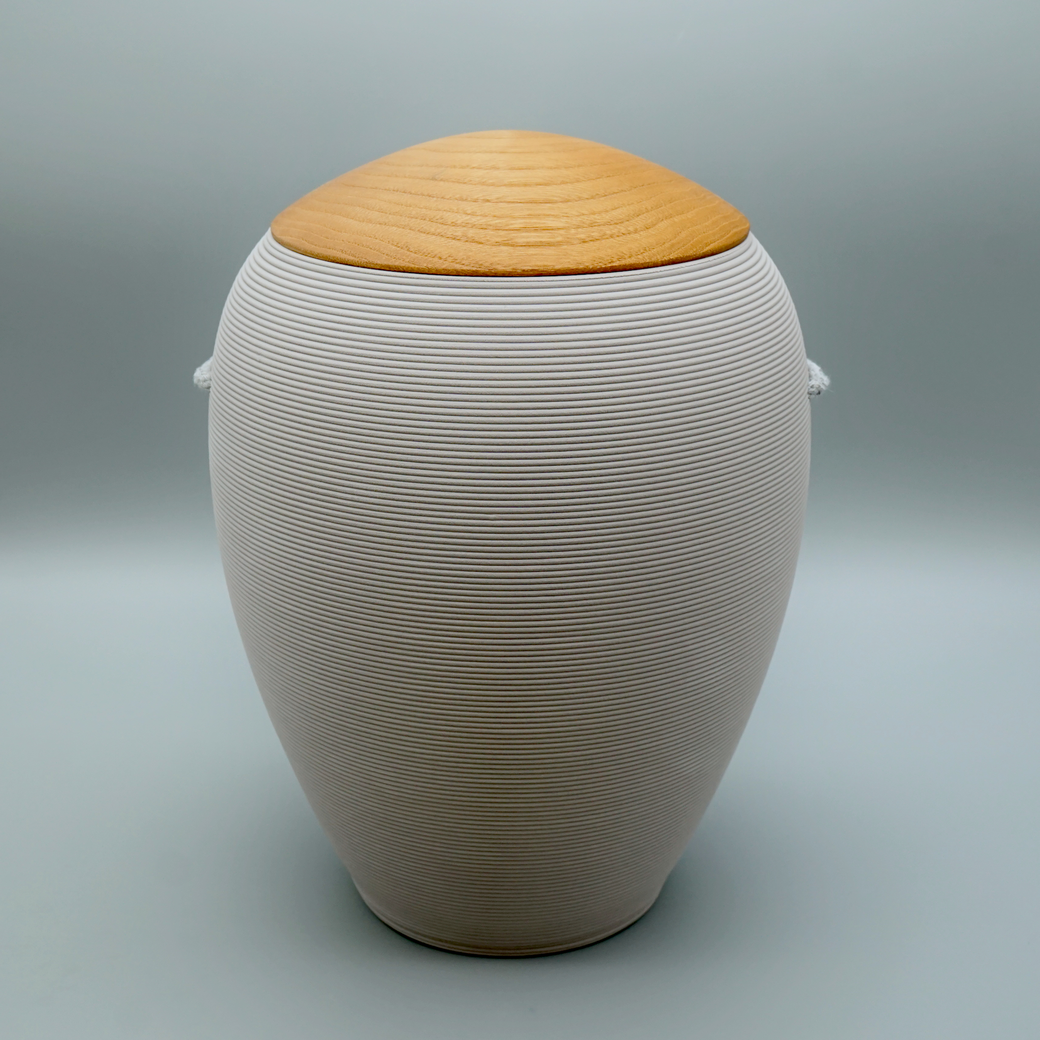 Die Urne Numa ist in Creme und in Grau verfügbar und wird mit einem Oberteil aus Kastanienholz ausgeliefert. Da diese Urne keine Aschekapsel aufnehmen kann, ist ein zertifiziert vergänglicher Aschebeutel im Umfang enthalten.